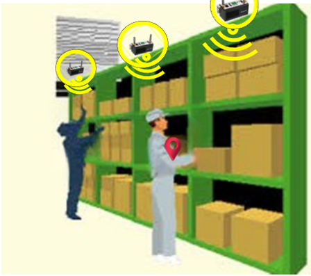 作業スタッフ様がBLEビーコンを携帯し、棚などに設置されたゲートウェイがビーコン電波を受信し位置検知を実施します。