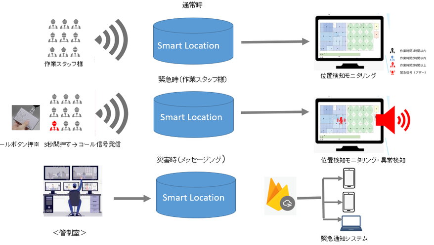 | レシーバーの運用タイプ | 各ロケーションに必要数を固定設置 | 業務用スマホ/スマートデバイスにGateWayアプリを常駐。バックグランドで常時稼働。 |