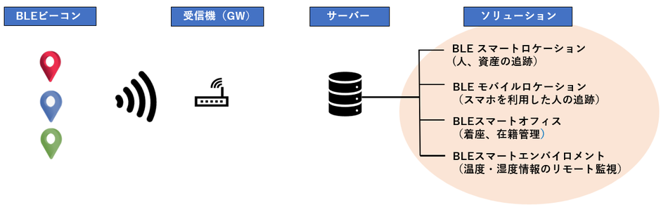 位置判定対象(ひと・もの・車両等)にビーコンを取り付け(携帯し)各ロケーションに設置されたBLE専用レシーバー(ゲートウェイ)がビーコンから発信される情報を受信し位置判定をする。
