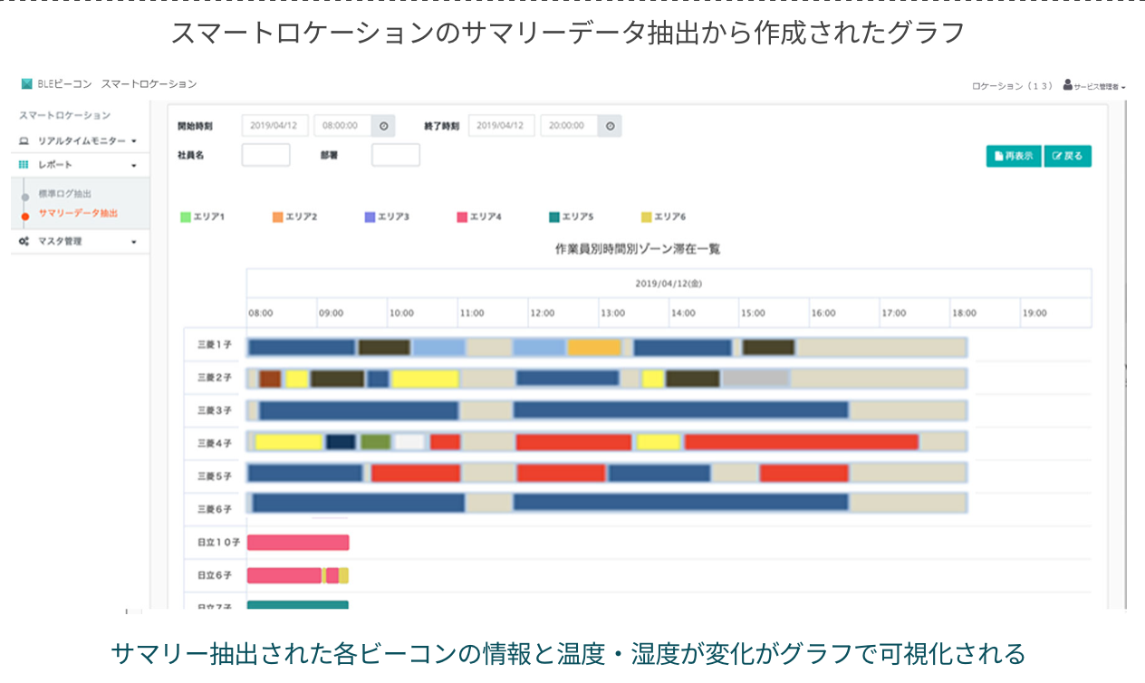 位置判定サイクル毎の受信ビーコン(強度)上位6個のデータと判定結果(標準ログ)と検知対象(人・もの)がどこにどの程度に時間滞在したかのサマリー(サマリーログ)情報を時間軸で抽出しCSV及びグラフ表示で閲覧することが可能です。