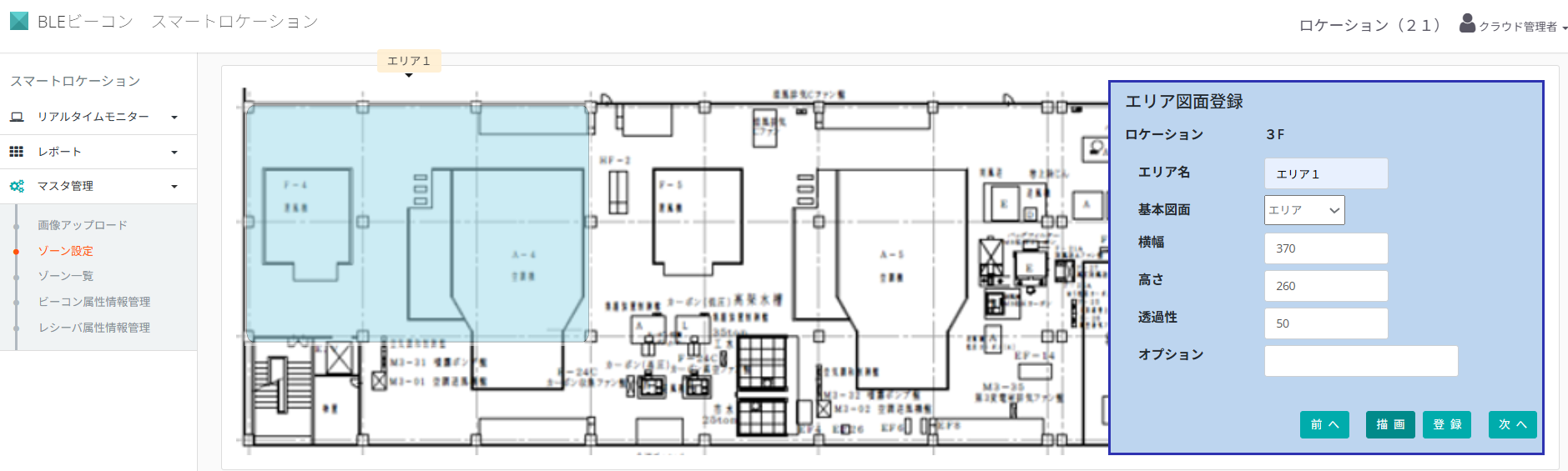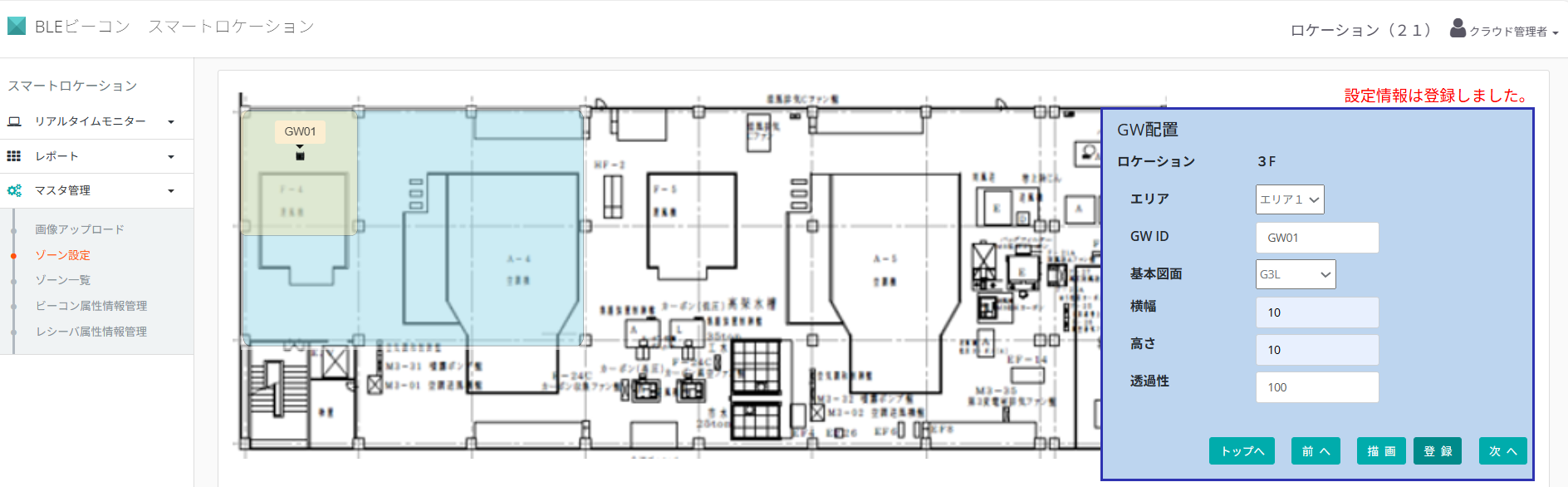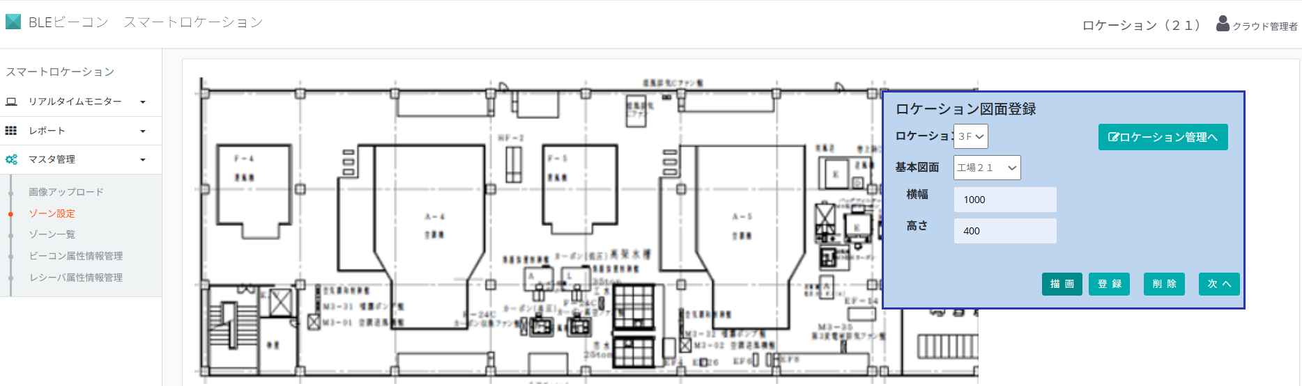 図面登録、ゾーン設定、ビーコン及びレシーバーの属性情報及び各種設定を自由にして頂きます。