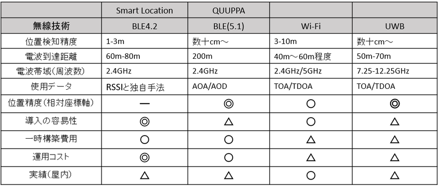 位置精度に関しては弊社BLEスマートロケーションの場合相対座標軸を測位しておりませんので比較としては不可としました